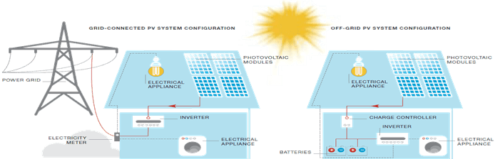 Şebekeden Bağımsız Sistemler (Off-Grid) : Yerel elektrik hatlarına ulaşmanın imkansız veya çok masraflı olduğu durumlarda kullanılır. Burada kullanılan cihazlar şebeke bağlantılı sistemlerle neredeyse aynıdır. Bu sistemlerde üretilen enerji akü gruplarında depo edilmekte ve bu depo edilen enerji İnverterler vasıtasıyla şebeke gerilimine dönüştürülmekte ve kullanıma sunulmaktadır.